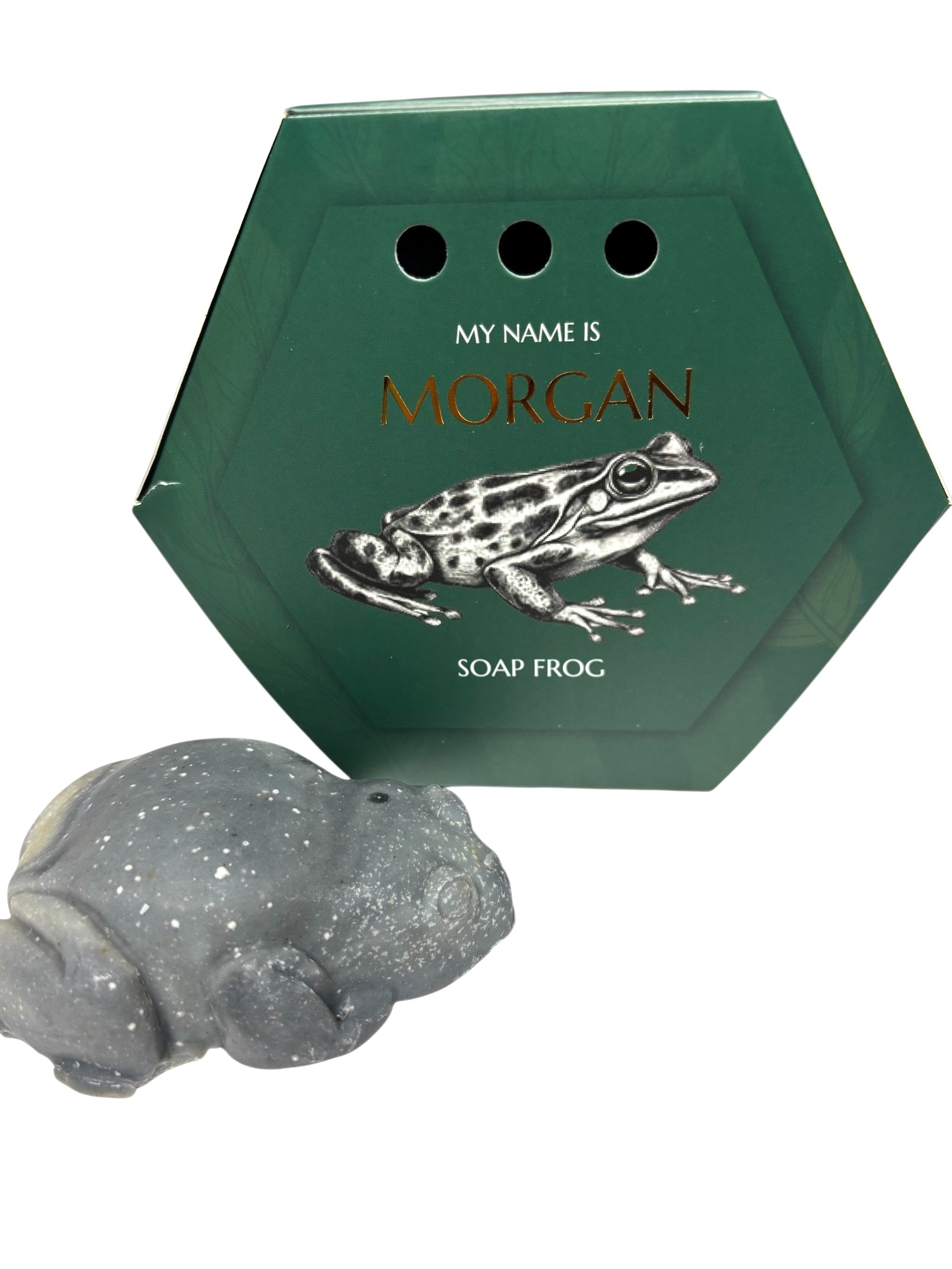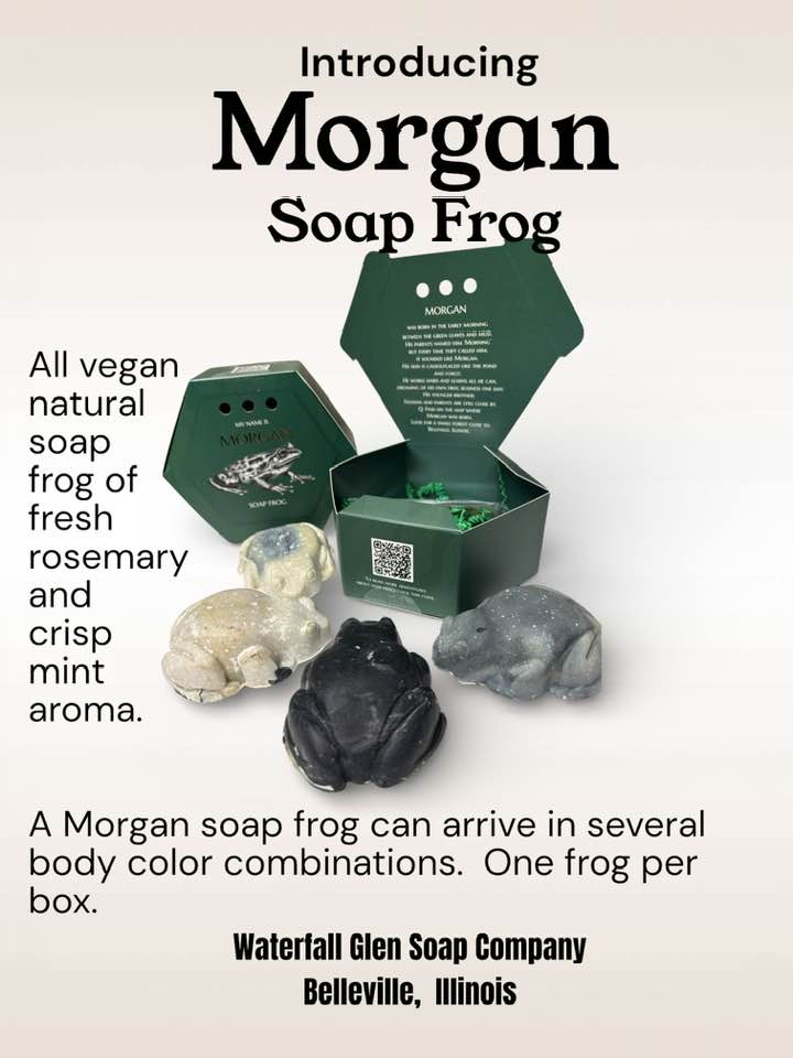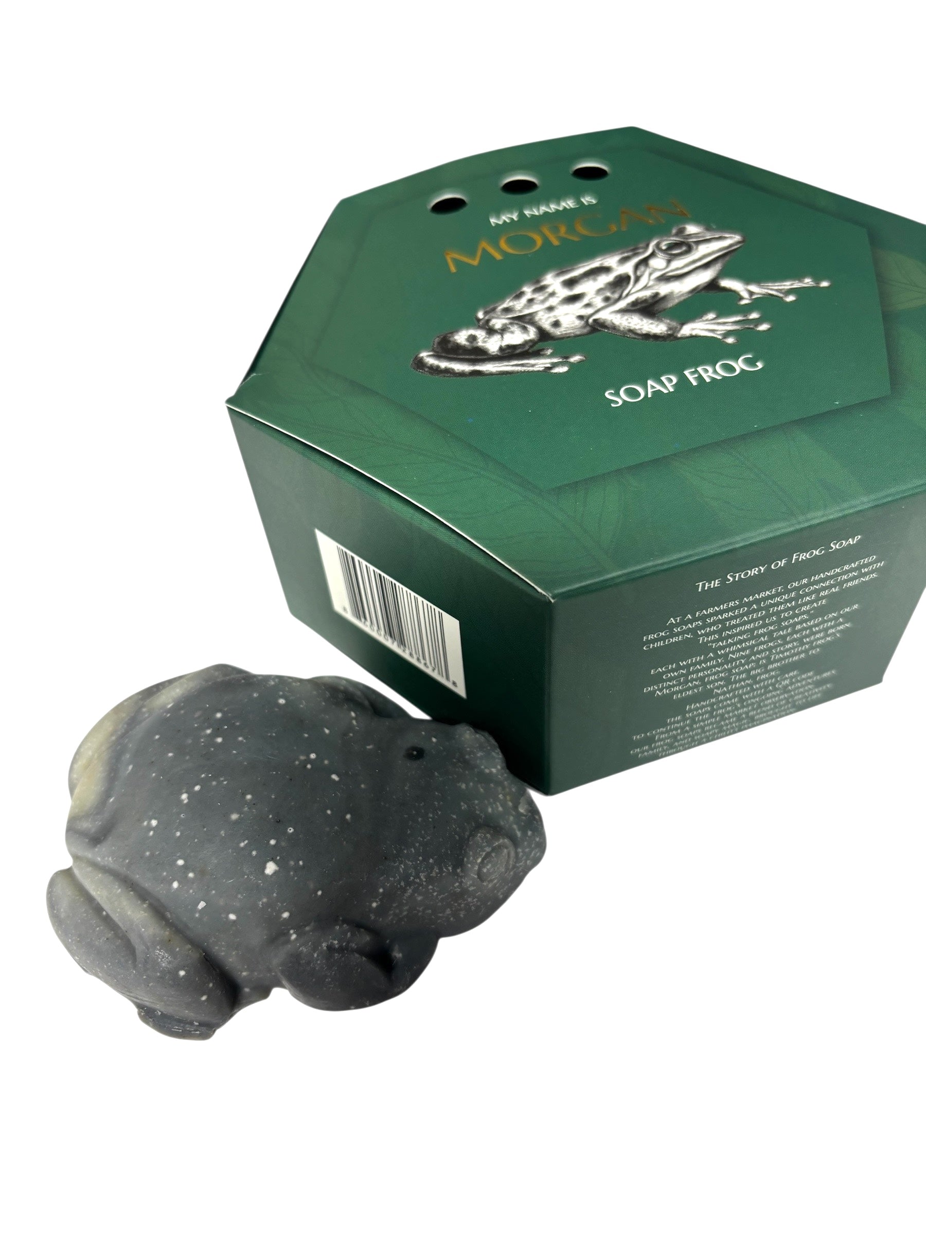 Morgan the Frog is a 3.5 ounce rosemary and mint frog soap bar for kids. The pattern will vary from green to black swirls. Every purchase comes in a sturdy cargo box with a character backstory and training manual to teach your frog soap tricks.